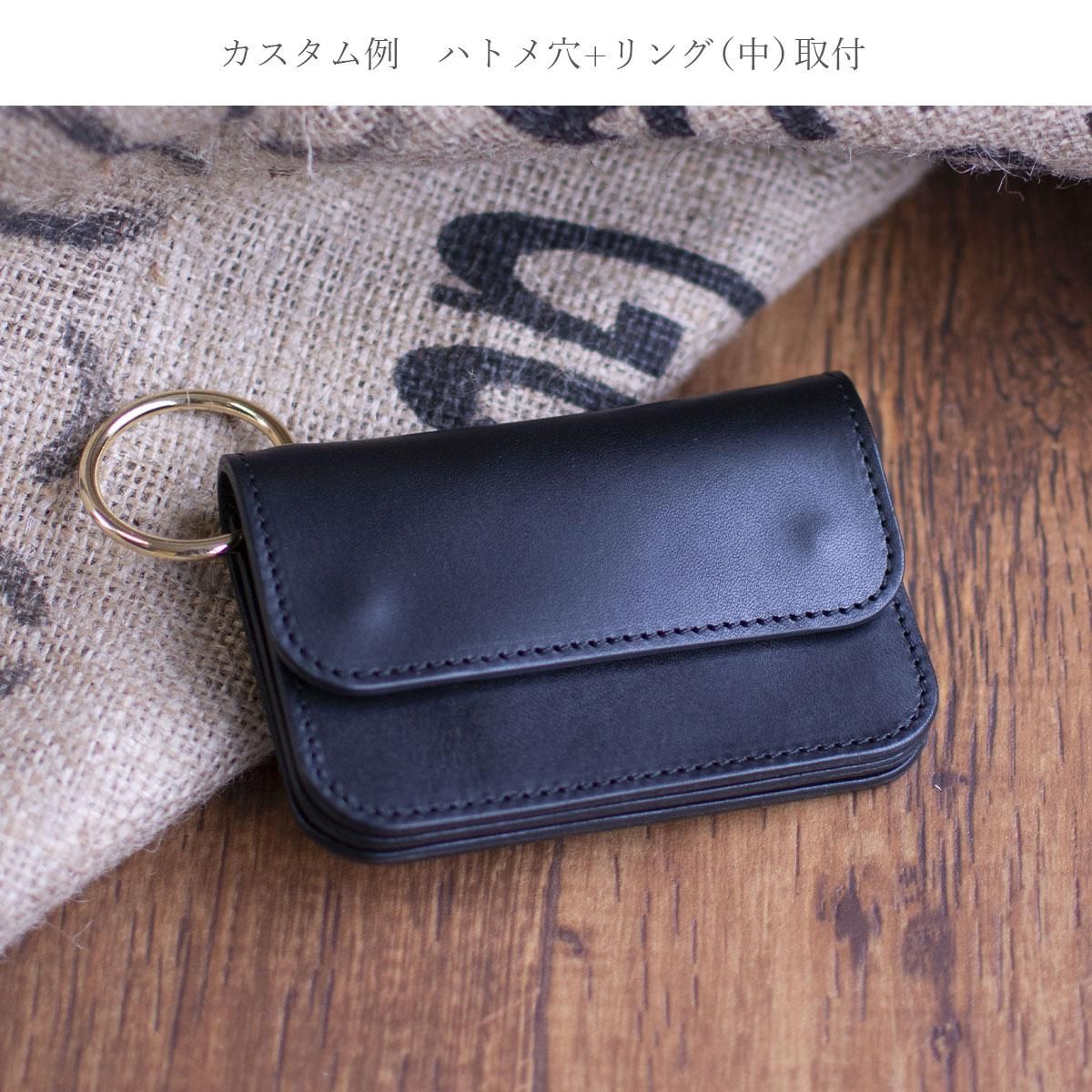 チェーンやコードの取り付けだけでなく、リングを取り付けると革に光り物がプラスされてドレッシーな印象になり、男性だけでなく女性にもおすすめのオプション加工です。