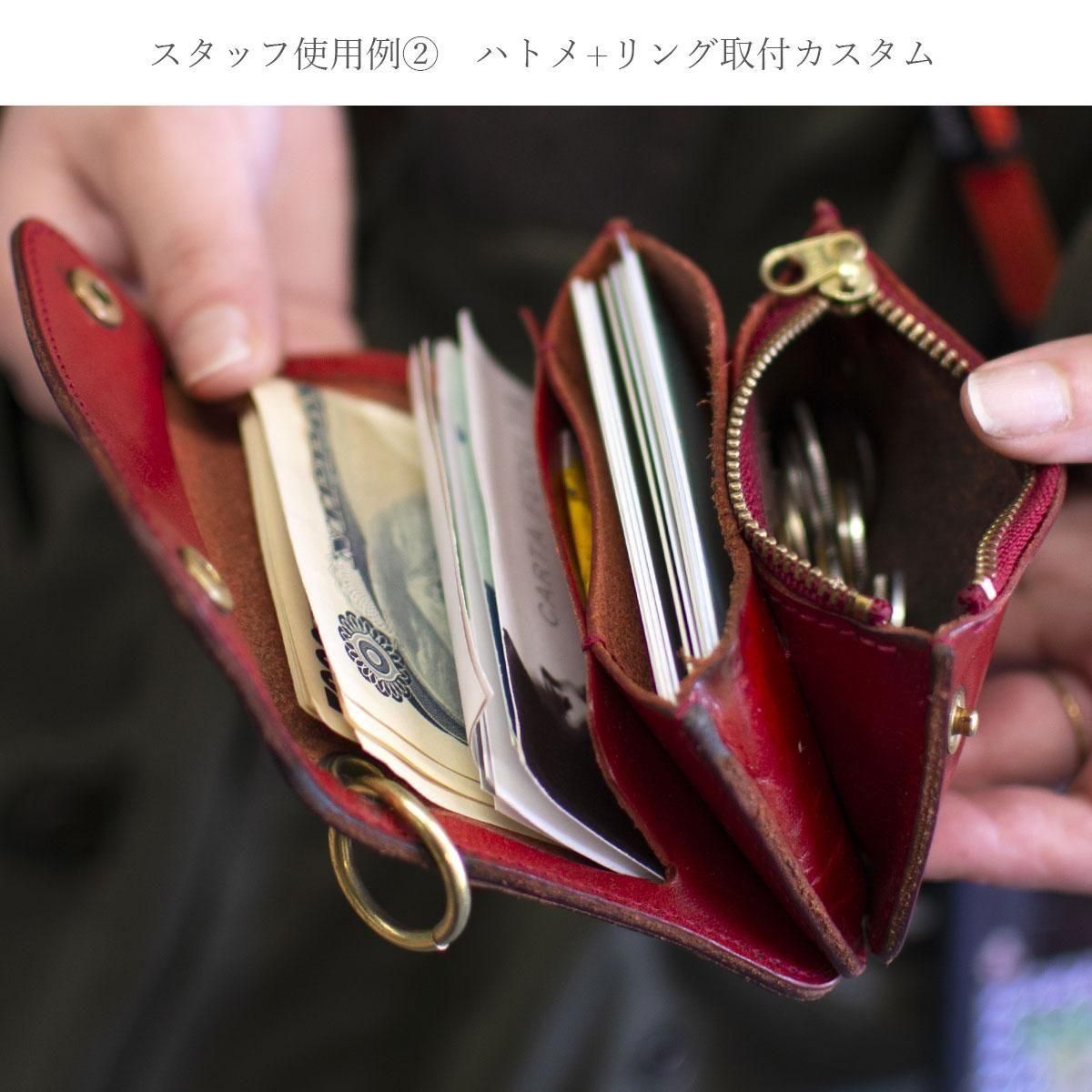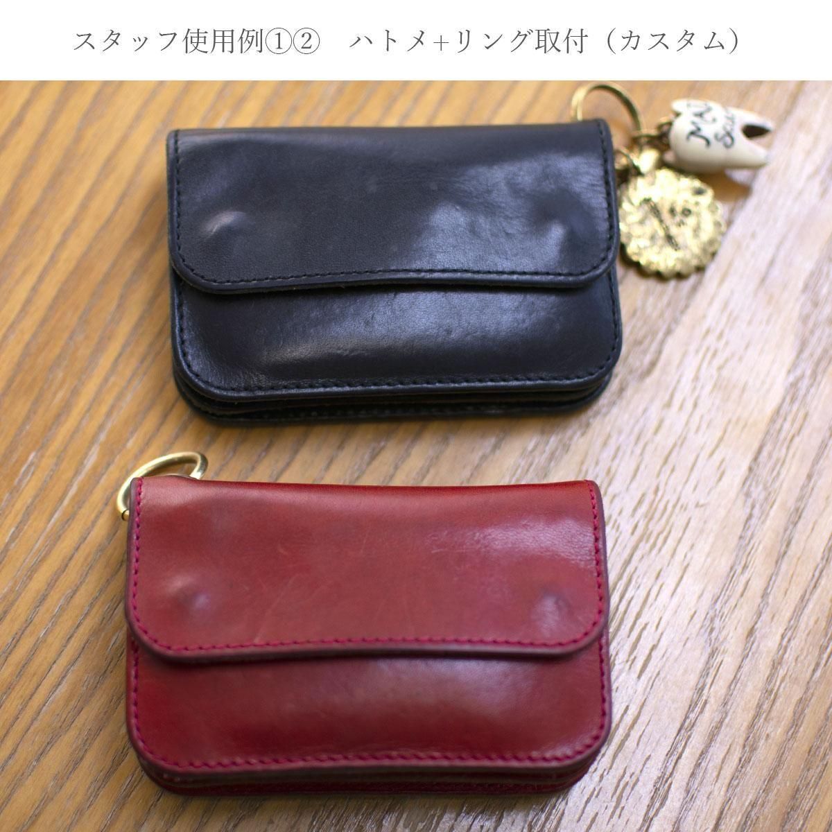 チェーンやコードの取り付けだけでなく、リングを取り付けると革に光り物がプラスされてドレッシーな印象になり、男性だけでなく女性にもおすすめのオプション加工です。
