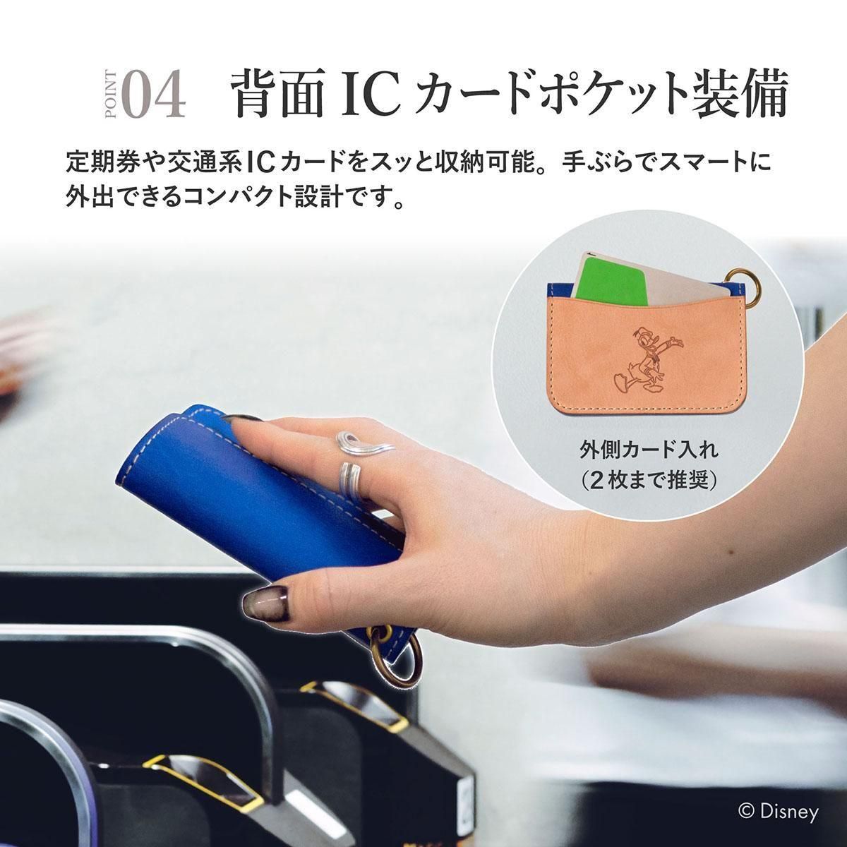 Disneyキャラクターの刻印入りの背面ポケットには、交通系ICカードや定期券を入れてタッチ&GO。これ1つでお出かけもできるコンパクト設計です。カードよりも一回り大きいサイズ感でズボンのポケットにも無理なく入ります。